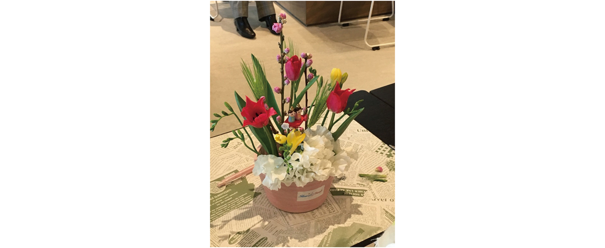 初めてのフラワーアレンジメント、ちゃんとできるかドキドキでした。真ん中のストローを基準に、チューリップ、フリージア、麦、桃の花、スイトピーと順番に、この辺かな?とお話ししながら楽しく体験することができました。お花の香りで癒され、春を感じられる1日でした。季節ごとにできたらいいな~。